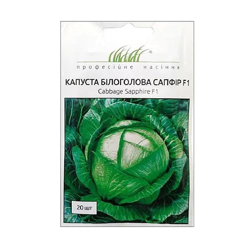 Капуста білокачанна Сапфір f1 – це пізній гібрид. Термін дозрівання 100-110 днів. Насіння висівають на розсаду з наступною висадкою у відкритий ґрунт. За ранньої висадки розсади збирати врожай можна наприкінці серпня — на початку вересня. При пізнішій висадці збирати врожай можна у жовтні для тривалого зберігання (термін зберігання близько 6 місяців). Вирощують гібрид як особистого споживання, так реалізації на свіжому ринку. Головки капусти зеленого кольору, однорідні, округло-плескаті. Вага в середньому 2-2,5 кг, але може досягати 5 кг. Внутрішня качан середнього розміру, сама головка всередині щільної структури з високими смаковими якостями. Жорсткість листа середня, є восковий наліт, що робить капусту стійкою до поразки шкідниками, зокрема, трипсами. Гібрид стійкий до бактеріозів.