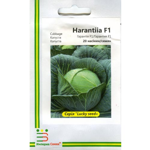 Капуста білокачанна Гарантія F1 - пізньостиглий високопродуктивний гібрид капусти білокачанної. Призначена для вирощування у відкритому ґрунті. Використовується для свіжого ринку та переробної індустрії (шаткування, заквашування). Головка округла, щільна, листя тонке, біле, не розтріскується. Середня маса голівки – 3-3,5 кг. Відмінні смакові та товарні якості.