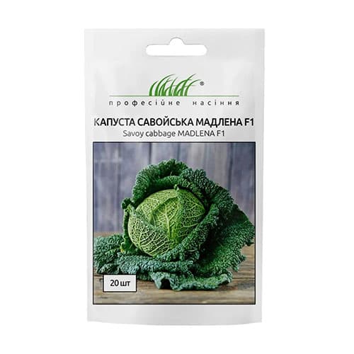 Капуста савойська Мадлена F1 - термін дозрівання 80-90 днів. Рекомендується для використання у свіжому вигляді та домашній кулінарії. Розетка листя піднята. Лист великий, темно-сіро-зеленого забарвлення з восковим нальотом середньої інтенсивності, сильно пухирчастий, хвилястий по краю. Качан округлий, покритий, на розрізі жовтуватий, від пухкої до середньої густини. Маса качана – 2,0-3,5кг.