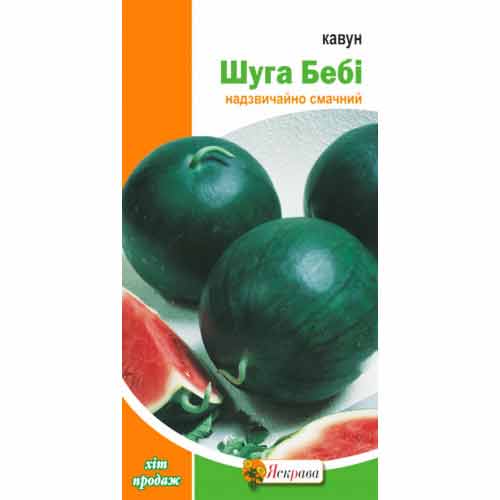 Кавун Шуга Бейбі – ранній сорт. Це шедевр французької селекції 50-х років, який досі успішно культивується у наших широтах. Середня вага кавуна з червоною цукровою м'якоттю-1-4 кг, а врожайність з 1 кв. м.-10-15 кг соковитих плодів. Причому плодоносить «Цукрове маля» і в умовах посухи, і в холодні літа.