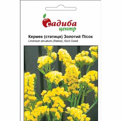 Кермек (статиця) Золотий пісок – високий однорічник, який ідеально підходить для прикрашення святкових букетів та виготовлення зимових сухих флорістичних композицій. Його дрібненькі квітки зібрані у великі суцвіття яскравого жовтого кольору. Цвіте рослина з липня до заморозків. Вона гармонійно виглядає у альпінаріях, квітниках та міксбордерах, рабатках та клумбах.