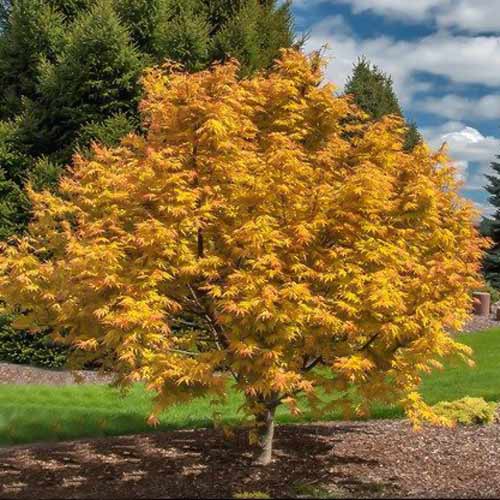 Клен пальмолистий Оранж Дрім – чудове деревце для прикраси ландшафту висотою до 4,5 м. Зростає культура відносно повільно – щорічний приріст складає 50-70 см. Крона розкидиста, діаметром 2,5-3,5 м. Основна прикраса рослини – листя. Воно розітнуте, нагадує витончене мереживо, міняє забарвлення кілька разів в сезон. Навесні листя ніжно-зелене з яскраво-червоним кантом, влітку зелень темніє, а восени переходить в жовто-помаранчевий відтінок. Ще одна перевага дерева – зелена кора, яка додає йому декоративності. Замовляйте саджанці клена пальмолистого Оранж Дрім, з його допомогою можна прикрашати навіть невеликі ділянки!