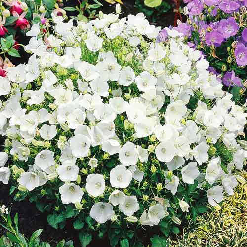 Дзвоник карпатський Білий килим – багаторічна рослина з дрібними листочками та великими білими квітами, які формою нагадують дзвіночки. Рослину використовують для декорування схилів альпійської гірки, дзвоник ніжно виглядає в підвісних кашпо, балконних ящиках і контейнерах на ніжці. У килимовій клумбі ця рослина теж дуже доречна.
