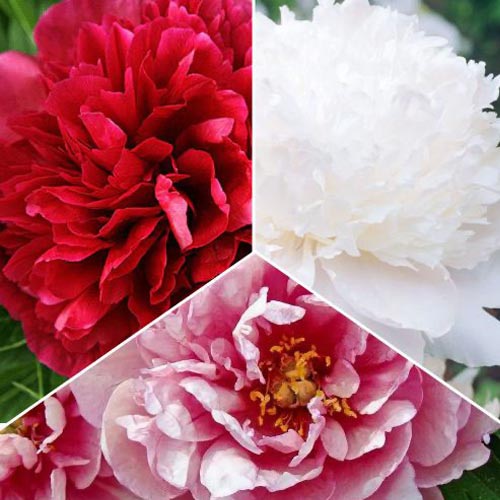 Давно мріяли виростити на своїй ділянці півонії, але все не наважувалися на покупку? Тоді наша суперпропозиція саме для вас! Колекція рідкісних сортів махрових півоній з 3-х сортів: насичено-червоних, яскраво-рожевих і кипенно-білих тонів. Чарівні своєю красою квіти півоній не поступаються за виразністю навіть королеві квітів. Метрової висоти кущі з темним, ажурним листям, що витончено схиляються під вагою пишних різнокольорових бутонів, мають чудовий вигляд у будь-яких квіткових композиціях.