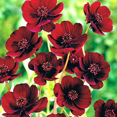 Космея Шоколадні оборки - багаторічна рослина, що виростає до 1,5 метрів у висоту. Квітки середніх розмірів - до 5 сантиметрів у діаметрі з пелюстками бордового кольору. У віночку завжди парна кількість пелюсток у кількості від 6 до 10 штук. Пелюстки оксамитові, злегка ажурні. Космея Шоколадні оборки вражає своїм ароматом - квітки виділяють яскравий шоколадно-ванільний запах, за що сорт і отримав свою назву. У вирощуванні рослина невибаглива, хоча на родючому і пухкому ґрунті дає найкращий результат.