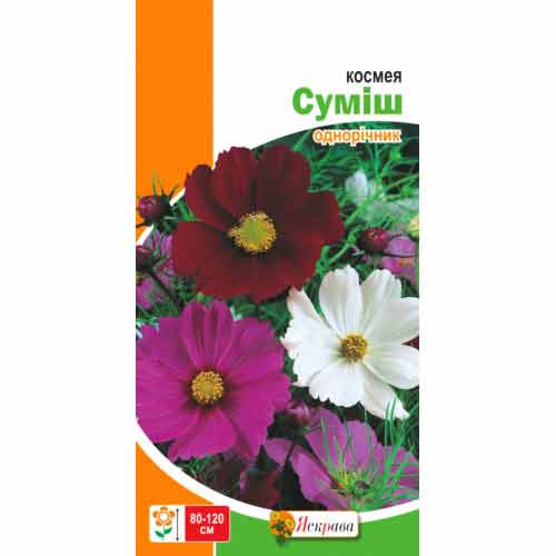 Космея високоросла, суміш забарвлень - це чарівний однорічник з крупними та яскравими квітами. Мереживне листя створює повітряний фон для темно-вишневих, червоних, рожевих чи білих віночків. Кущ високий, густогіллястий. Бутони утворюються у великій кількості з липня до настання холодів. Цвітіння безперервне.
