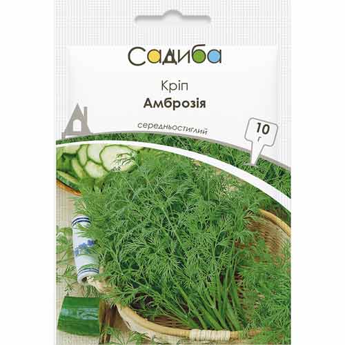 Кріп Амброзія - середньостиглий кущовий сорт кропу, для відкритого і захищеного ґрунту. Термін дозрівання 40-45 днів. Рослина високоросла, розлога, довго не переходить до стеблування, що дає змогу подовжувати термін господарської придатності. Листок темно-зелений, короткочерешковий, ніжний, із сильним ароматом.