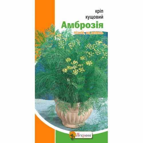 Кріп Амброзія - пізній кущовий сорт. Цей міцний кущ досягає у висоту до 1 м, а його листя вирізняється восковим нальотом і сильним ароматом. З однієї рослини зрізають урожай до 3-4 разів за сезон, оскільки період росту зеленої маси не обмежений. Амброзія генетично стійка до різних захворювань і довго не зацвітає. Такий кріп на городі можна використовувати ще й як ширму від сонця для овочевих культур.