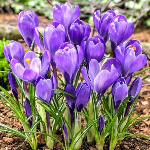 Крокус Гігант Блю - великоквіткова цибулинна рослина невеликої висоти. Під час цвітіння досягає 10-15 см, з яких 2-3 висоти займає лілова квітка. Вони зацвітають ранньою весною і зберігають пік декоративності майже місяць. Квіти часто з'являються вже в березні, коли в саду ще лежить сніг. У сонячну погоду квітки розкриваються, оголюючи жовто-помаранчеві тичинки. Вони чудово пахнуть медом і є першою їжею для бджіл після зими.