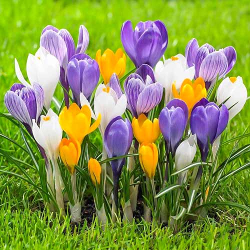 Крокус Large Flowering Mixed - набір, що складається з найкрасивіших сортів. Посаджені разом, вони створюють незвичайний ефект на газоні, клумбі, рокарії або бордюрі клумб. Квітки великі, чашоподібної форми, бувають білого, жовтого і різних відтінків синього. Вони широко відкриваються в сонячні дні і закриваються вночі та в похмуру погоду. Вони виділяють приємний медовий запах і є їжею для дуже корисних комах-запилювачів.