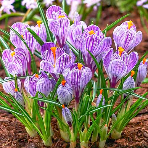 Крокус Страйпед - витончена квітка з ефектним біло-фіолетовим контрастним забарвленням та жовтогарячими тичинками, яка буде справжньою окрасою саду з березня до квітня. Висота квітки - від 8 до 13 см, закритою вона має форму келиха, відкритою - форму зірки. Листя вузьке, густе, темно-зеленого кольору, посередині - світліша смуга, завдяки чому рослини виглядають декоративно протягом тривалого періоду. Листя з’являється одночасно з квітами або трохи пізніше, починає активно рости по завершенню цвітіння.