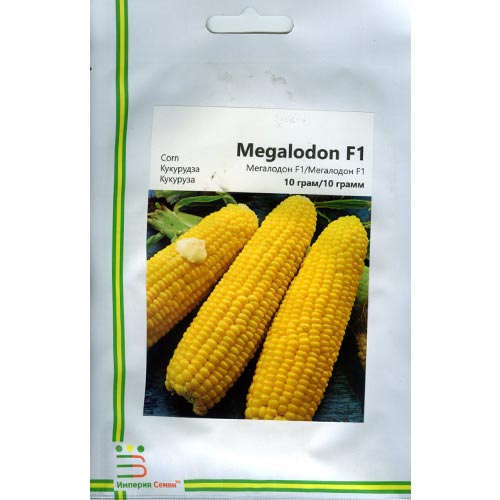 Кукурудза Мегалодон F1 - пізній суперсолодкий гібрид цукрової кукурудзи. Формує 1-2 потужні качана циліндрично-конусовидної форми із зерном жовтого кольору. Довжина качана – 22-23 см. У качані зерна великі, добре і рівно заповнені. Кукурудза Мегалодон F1 підходить для свіжого ринку та промислової переробки. Вирощується у відкритому ґрунті.