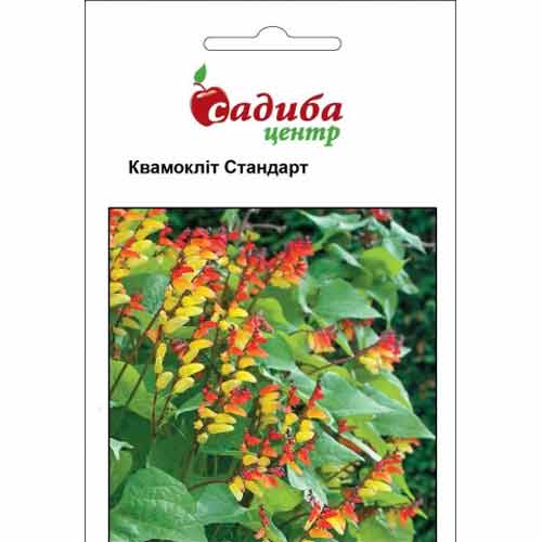 Квамокліт Стандарт – швидкорослий однорічник із густим зеленим листям та ефектними квітами-краплинами. Вони зібрані у односторонні колосоподібні суцвіття довжиною до 20 см. Цікаво, що у одному суцвітті може бути 10 бутонів різних відтінків – по мірі розвитку вони змінюють своє забарвлення з червоного через помаранчевий та жовтий до ніжно-білого. Ліану часто використовують для оформлення вертикальних садових композицій, затінення балконів і альтанок.