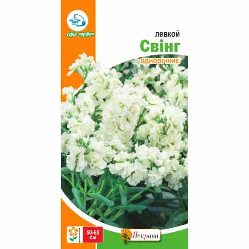 Левкой Свінг 0.2 - витончений і ніжний однорічник. Білі махрові суцвіття густо всіюють стрункі стебла, ніби запрошуючи Вас підійти ближче, щоб на повні груди вдихнути чудовий аромат. За запах та зовнішній вигляд квіти левкоя ще називають матіолою. Коли бутони починають пахнути, вони дарують гарний настрій усім довкола. Зрізані для букета, ці запашні колосся з пелюсток внесуть гармонію до будь-якого приміщення.