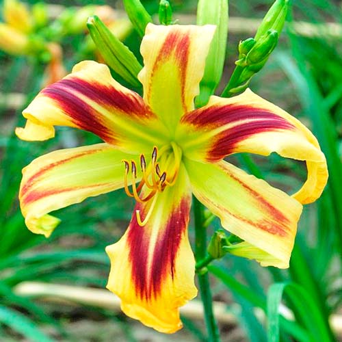 Лілійник Фрі Вілін (Hemerocallis Free Wheelin) – гібридний трав'янистий багаторічник, висотою до 80 см. Кожна квітка розпускається лише на один день (у похмуру погоду – до шести днів), але на кущах їх формується по 45-50 шт. Діаметр бутонів-спайдерів дорівнює 20 см. Пелюстки закручені назовні, вони жовті, а горло – блідо-зелене із бордовою облямівкою. Рослини добре виглядають в якості солітерів посеред газону, їх можна розміщувати поряд із водоймами та іншими багаторічниками.
