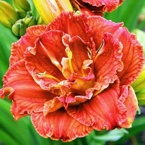 Лілійник Паприка Флейм виправдовує свою назву — його квітки дійсно схожі на язики полум’я. Вогненно-червона махрова квітка покрита тонкими темними прожилками. Краї пелюсток сильно гофровані. Діаметр чаші в розпуску — 13−15 см.