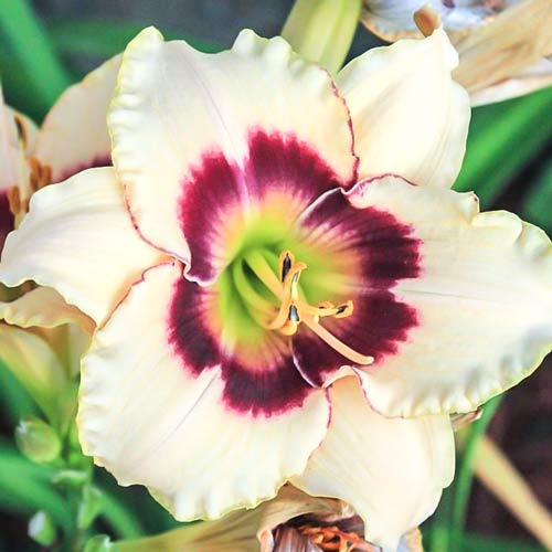 Лілійник Распберрі Кенді – чудовий сорт з незвичайним забарвленням бутонів. Основна площа пелюстки – молочно-біла з дуже тонким кантом, жовтим ближче до кінчиків й бордовим в районі горла. Біля центру квітки світлий відтінок стає винним, який, у свою чергу, міняється на жовто-рожевий й, нарешті, переходить в зелене горло. Пелюстки дуже широкі. Висота рослини сягає 65 см та приблизно на стільки ж квітка розростається в діаметрі. Цвітіння настає в середині літа й триває до трьох тижнів. Купуйте лілійник Распберрі Кенді – це просто знахідка для декорування ділянки, навіть одиночна посадка виявиться дуже ефектною.