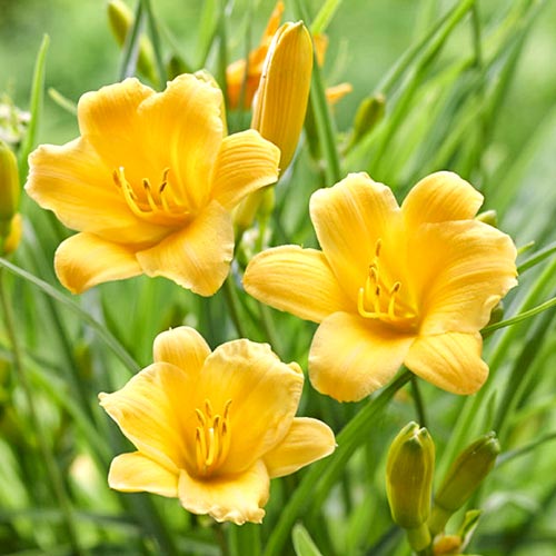 Лілійник Єллоу (Hemerocallis Yellow) – чудова сонячно-жовта культура до 50-70 см заввишки. Розпускається в червні – липні. Одноколірні ніжні бутони добре підкреслює подовжене малахітове листя. Якщо хочете створити клумбу радісних відтінків, можна посадити туди поряд з лілійником і інші квіти схожого кольору. Невеликі групи рослин будуть гармонійно виглядати посеред газону.