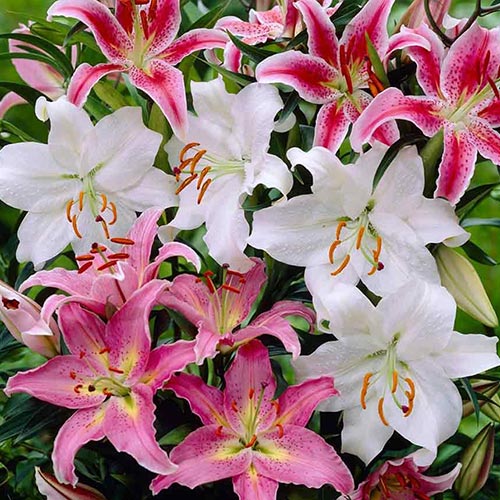 Лілії орієнталь (східні) відрізняються п'янким ароматом, який випромінюють квітки що розпустились. Розкішні, розлогі кущі цвітуть наприкінці літа, дарують водоспад фарб і відтінків. Ми включили в суміш наступні види: