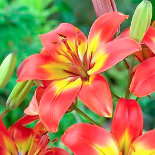 Лілія азіатська Форевер Лінда - це цибулинна багаторічна рослина з квітами, що сліпучими красою. Здається, що на пелюстки вихлюпнули живе полум'я, і спалахи помаранчевого і жовтого відтінків застигли в химерному малюнку. Яскраві оранжево-червоні краї пелюсток і пронизливо-жовта серединка - чарівний танець кохання. Діаметр квітки - 15 см, висота рослини - 70 см. Сорт має приємний аромат, вирощується на зрізання і для прикраси ландшафту саду.