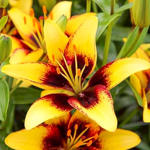 Лілія азіатська Бамблбі (Lilium Bumblebee) – велика квітка висотою до 80-100 см та діаметром бутонів близько 20 см. На кінчиках пелюстки жовтогарячі, а ближче до середини – насиченого бордового відтінку. Аромат слабкий, ненав’язливий. Вирощують цей гібрид як окремими групами, так і поряд з жовтими або бордовими сортами. З нього створюють чудові екзотичні букети.