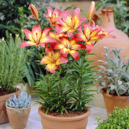 Лілія азіатська Коста Дель Сол розкриває в червні екзотичні квіти діаметром до 13 см. Жовті біля основи пелюстки забарвлені на кінчиках у малиново-червоний колір. Сорт однаково красиво виглядає в садової та горщиковій культурі.