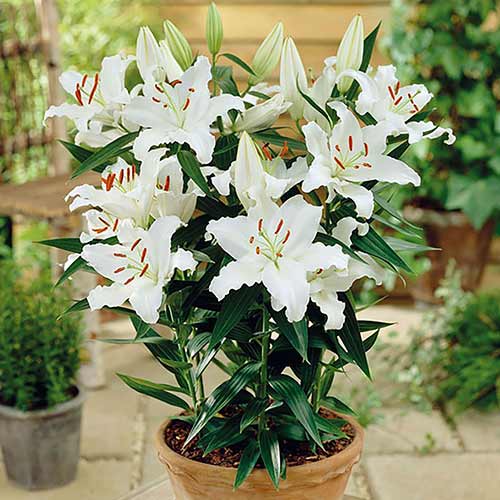 Лілія орієнталь Родолфа — низькорослий сорт, який відмінно виглядає як на садовій клумбі, так і у вазоні. На одному стеблі формується 2−3 бутона. Чашовидні квіти діаметром до 10 см мають білосніжне забарвлення. Салатова квітконіжка прикрашена довгими малиновими пиляками.
