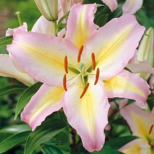 Лілія орієнталь Зірковий Класс (Lilium Star Class) – вишукана квітка до 90-120 см заввишки. Бутони великі, пелюстки пофарбовані в ніжний рожевий відтінок, посередині кожного проходить жовта широка смужка. Цвітіння починається в липні, супроводжується відчутним приємним ароматом. Лілія гідно виглядає у квітниках та при окремій посадці, підходить для створення святкових букетів.