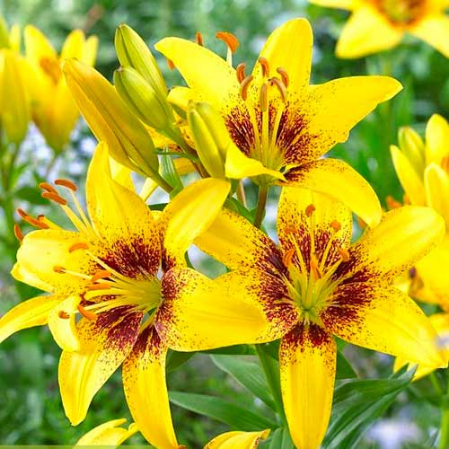 Лілія азіатська Єллоу Пікселс - садовий багаторічник з чарівними квітами відтінку яєчного жовтка з щедрим розсипом бордово-шоколадних веснянок на пелюстках. Квіти мають широко відкритий віночок, на стеблі в момент розпуску всіх бутонів утворюється ефектний букет. Висота стебла від 60 до 90 см. Сорт вирізняється високою зимостійкістю, цибулини прекрасно зимують у відкритому ґрунті без пересадки та укриття.