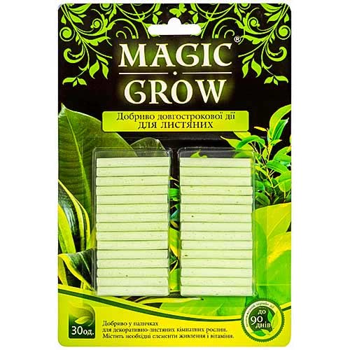 Magic Grow для декоративно-листяних кімнатних рослин - добриво у формі паличок з тривалою дією (до трьох місяців). Забезпечує рослини комплексом вітамінів і елементів, необхідних для гармонійного зростання і розвитку. Запобігає виникненню хвороб, підвищує імунітет рослин.