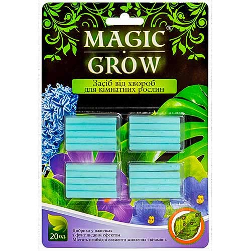 Magic Grow для кімнатних рослин від хвороб - спеціально удобрені палички, які відрізняються тривалим впливом. Засіб захищає від більшості поширених хвороб і запобігає їх появі. Комплекс вітамінів групи В у складі препарату підтримує здоровий вигляд рослин і позитивно впливає на їх декоративність.