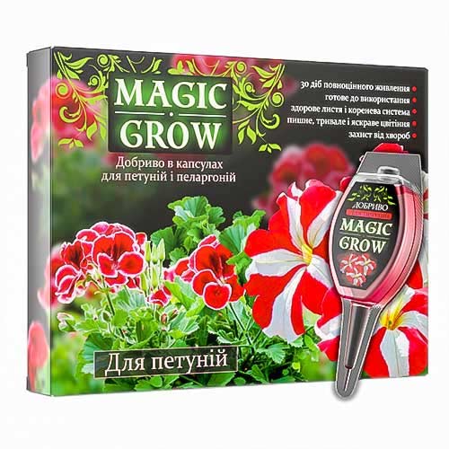 Magic Grow для петуній - добриво, розраховане спеціально на кімнатні та балконні квітучі культури. Наприклад, на бегонії, айстри, вербени, віоли. Засіб забезпечує тривале (до місяця) підживлення рослин всіма необхідними елементами. В результаті його впливу збільшується зелена маса рослин, продовжується цвітіння, коренева система стає сильнішою.