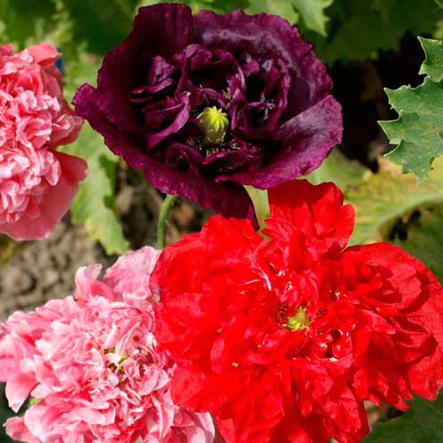 Мак махровий Хмаринка, суміш забарвлень - яскраве, барвисте, трав'яниста рослина з квітами різноманітних забарвлень. Великі, ефектні, махрові бутони шикарно виглядають у спільних композиціях з багаторічними кущами, однорічними квітами на газонах, в міксбордерах, і зрізаних букетах.
