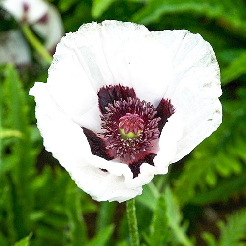 Мак східний Перрі'с Вайт – незрівнянний трав'янистий багаторічник з ніжним й виразним забарвленням. Білосніжні пелюстки ближче до серединки стають насичено-бордовими й гармонують по відтінку з тичинками винного кольору. Культура виростає до 0,8-1 метра, з віком стає дуже кущистою, тому при посадці потрібно це врахувати й залишити відстань між рослинами не менше 60 см. Квітка розпускається в кінці травня – на початку червня пік декоративності триває близько 2 тижнів. Якщо ви хочете милуватися грою контрастів на клумбі, замовляйте саджанці східного маку Перрі'с Вайт!