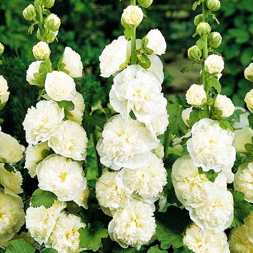 Мальва (шток-троянда) махрова Вайт (Alcea Double White) – рясно квітучий білий сорт приголомшливої краси. Висота квітконоса зі щільними великими бутонами досягає 1 метра. Цвітіння триває з липня по вересень. Рослини добре розвиваються на сонці і у напівтіні. Це незамінна культура для декорування будівель і парканів, при посадці з соняшниками та ромашками утворює пасторальний квітник, який не вимагає догляду, щільні моносортові посадки можуть використовуватися в якості живої огорожі при зонуванні простору.