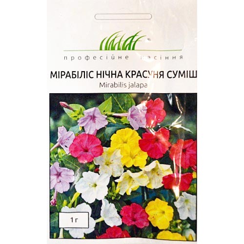 Мірабіліс Нічна красуня, суміш забарвлень – мікс із квітів яскравих строкатих забарвлень. Рослини досягають 60 см у висоту, мають листя декоративного вигляду та витончені великі квіти лійкоподібної фігурної форми. Відмінні риси мірабілісу – виключно нічне цвітіння, бутони розкриваються тоді, коли сонце йде за горизонт.