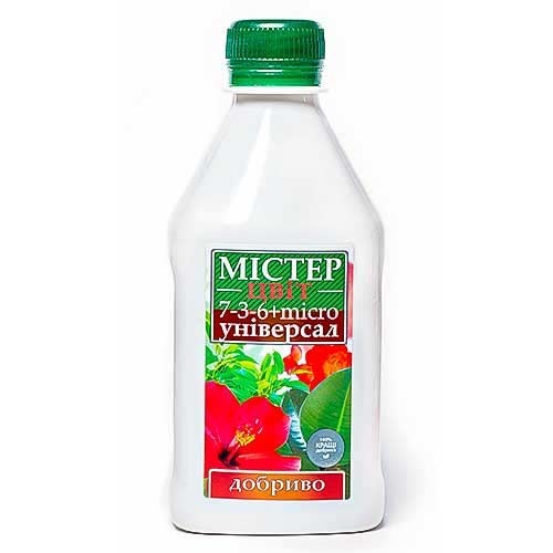 Містер-Цвіт універсал - препарат, який можна використовувати для кореневої і листової підгодівлі. Підходить для всіх кімнатних рослин. Його застосування прискорює ріст, збільшує тривалість цвітіння, сприяє формуванню сильних і здорових коренів.