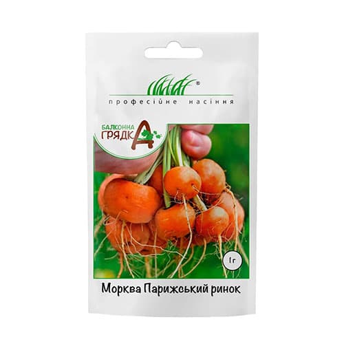 Морква кімнатна Паризький ринок – рання морква, паризького сортотипу. Відмінно підходить для вирощування в ящиках та горщиках на підвіконні. Вегетаційний період 75-80 днів. Коренеплоди мають округлу форму, інтенсивно-жовтогарячий колір і гладку поверхню, діаметром - 2-4 см. Сорт легко прибирати. Завдяки відмінному смаку можна використовувати як у свіжому вигляді, так і для консервування, без попередньої шатківниці. Морква добре зберігається у холодний період. Насіння висівають у ґрунт на глибину 1,5-2 см. Найкраща температура для пророщування 15-24°С. Після появи сходів рослина бажано прорідити, залишивши найпотужніші паростки, інтервалом 2 см один від одного. Не бажано залишати грядки під прямим сонячним промінням. Поливати рослини рекомендується часто, але потрібно стежити, щоб не було надлишку вологи. Іноді можна підгодовувати добривами з низьким вмістом азоту.