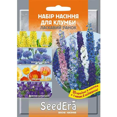 Набір насіння квітів Ласкавий ранок з 5 упаковок - можна порівняти з вранішним небом. Коли чорні фарби починають поступово бліднути і змінюються на ніжно-лілові. Крізь світанок поступово пробиваються перші сонячні промені. Такий світанок легко створити в саду, якщо висадити в ньому насіння з набору "Лагідний ранок". Цвітіння клумби починається в травні і закінчується в жовтні. Дотримуйтесь рекомендованої схеми висадки клумби, і кольори ранкової димки будуть радувати вас протягом кожного дня