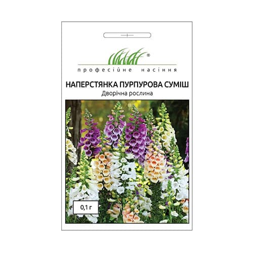Наперстянка пурпурова, суміш забарвлень – дворічна декоративна та лікарська рослина, її трубчасті квітки різних забарвлень зібрані в колосоподібні суцвіття. Наперстянка досить висока (50-60 см), у квітниках не загубиться на тлі інших культур. Квітне на другий рік, за сезон може цвісти двічі.