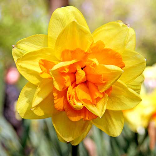 Нарцис махровий Monza - дивовижний цибулинний багаторічник з махровими яскравими квітами. Коронка квітки забарвлена в оранжево-жовті тони, пелюстки - яєчно-жовті. Листя зелене, вузьке, лінійне. Розмір квітки - до 10 см. Висота рослини - до 45 см. Нарцис Monza покаже всю свою красу в композиціях, що складаються з декількох штук одного сорту, і в поєднаннях з іншими сортами нарцисів або тюльпанів. Квітки виділяють тонкий аромат і підходять для зрізання і складання букетів.