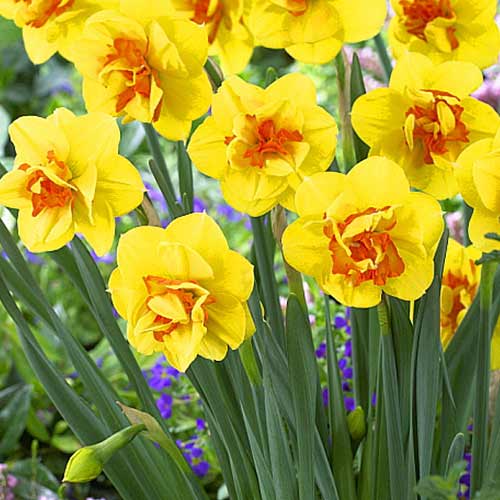 Нарцис махровий Тамар Фаєр – витончений красунчик, чарівність якого дозволяє широко використовувати його для оформлення квітників відкритого ґрунту та вигонки. Пелюстки пофарбовані в жовтий колір, коронка – помаранчева. Квітки махрові, з витонченим ароматом. Висота сорту – від 40 до 50 см.