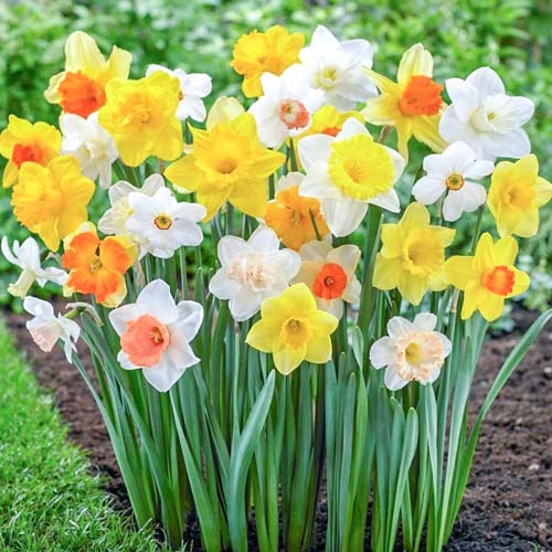 Нарцис великокорончатий, мікс - розкішний мікс високорослих сортів з великими ароматними квітками і довгими квітконосами. Всі великокорончаті прекрасно підходять для озеленення, прикраси саду і вигонки під зрізання, морозостійкі і швидко розмножуються, утворюючи щільні кущі однотипних рослин. Кілька клумб з такими квітами здатні перетворити навесні будь-який сад. Агротехніка всіх сортів однакова і гранично проста: восени посадили, навесні удобрили, коли цвітуть - полили і забули до наступної весни.