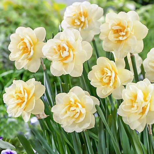 Нарцис махровий Менлі - високий сорт, що випромінює елегантність і стиль. Великі квіти складаються з декількох шарів кремово-жовтих пелюсток. Ідеально підходить для високих бордюрів, рокаріїв, простору під деревами і чагарниками, а також як зрізка для вази. Щоб підкреслити їхню унікальність, варто садити нарцис Менлі з іншими сортами з насичено-жовтими або рожевими квітками. Цвіте навесні, на межі квітня і травня. Виростає до 30-40 сантиметрів у висоту.