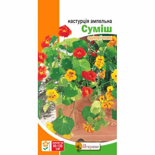 Настурція ампельна, суміш забарвлень – це мікс з насіння однорічних квітучих рослин із довгими розгалуженими пагонами та червоними, помаранчевими, жовтими квітами. Ними прикрашають балкони, веранди, садять у вазони та підвісні кошики, використовують у килимових композиціях. Плоди настурції додають до салатів і супів.