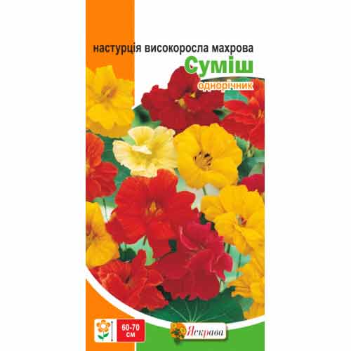 Настурція високоросла махрова, суміш забарвлень – набір насіння ефектних рослин, що мають різнокольорові махрові квіти, що витримані в жовто-коричневих тонах. Настурція – однорічна, цвітіння настає в червні, триває до вересня. Рослини можна вирощувати з насіння через розсаду і проводити посів безпосередньо у відкритий ґрунт. Замовити насіння настурції високорослої махрової рекомендується вже зараз, адже в березні-квітні приходить час вирощування розсади.