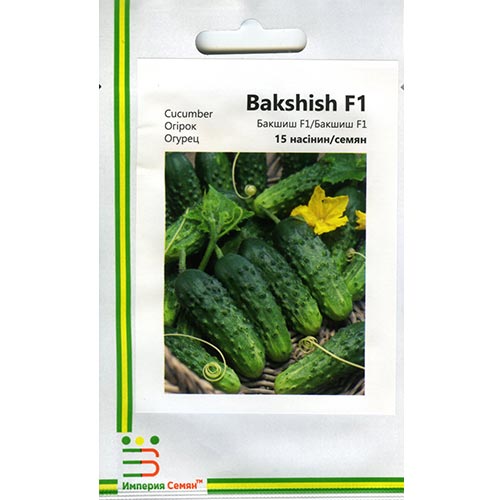 Огірок Бакшиш F1 – гібрид огірка партенокарпічного. Період вегетації до 40 днів. Призначений для свіжого вжитку, переробки. Віддає перевагу росту в теплицях, відкритих ґрунтах. Плід темно-зелений, циліндричний, середньогорбчастий, має щільну шкірку. Відмінний смак. Чудово транспортується. Має відмінну кореневу систему.