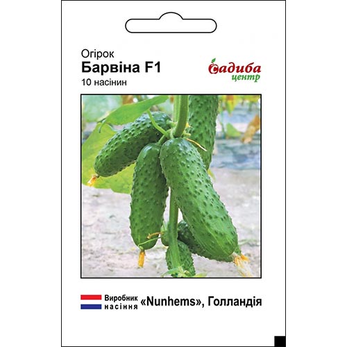 Огірок Барвіна F1 - ранньостиглий гібрид партенокарпічного горбкуватого огірка для вирощування в першому обороті. Рослина індетермінантна, середньоросла, слабогілляста, жіночого типу цвітіння. У пазусі листа формується 1-2 зав'язі. Плоди темно-зелені, блискучі циліндричні форми. Довжина 10-12 см. Маса зеленця 71-87 р. Дуже однорідні та привабливі. Висока врожайність та ранньостиглість. Призначений для вирощування у закритому ґрунті