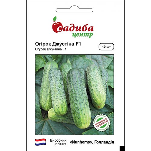 Огірок Джустіна F1 – партенокарпічний ранньостиглий гібрид генеративного типу з потужною силою росту. Рясне зав'язування дає змогу отримувати високий урожай корнішонів. Плоди однорідні темно-зеленого забарвлення, великогорбчасті. Після консервування плоди зберігають необхідну щільність і залишаються хрусткими. Співвідношення довжини плода до діаметра – 3,1:1. Для вирощування у відкритому ґрунті.