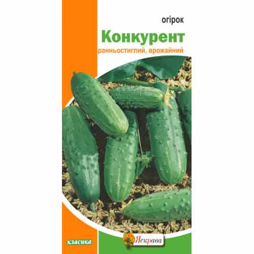 Огірок Конкурент - високоврожайний ранньостиглий сорт, вирізняється чудовим смаком, відсутністю гіркоти і невеликим розміром плодів, що особливо цінується при консервації. Термін дозрівання за 38-40 днів, зеленці довжиною до 11 см, вага близько 80-110 г. Його горбисті зеленці з тонкою зеленою шкіркою і салатовою м'якоттю гарні й у свіжому вигляді, вони містять потрібні організму вітаміни, мінерали, клітковину і корисні і дорослим, і дітям.